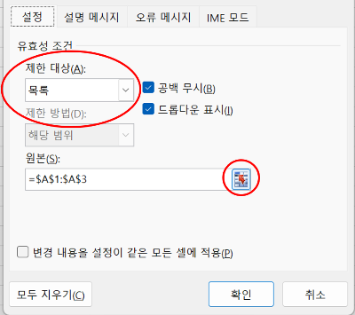 목록으로 설정 후 아래 그림의 선택1,2,3을 마우스 드래그하여 선택합니다.